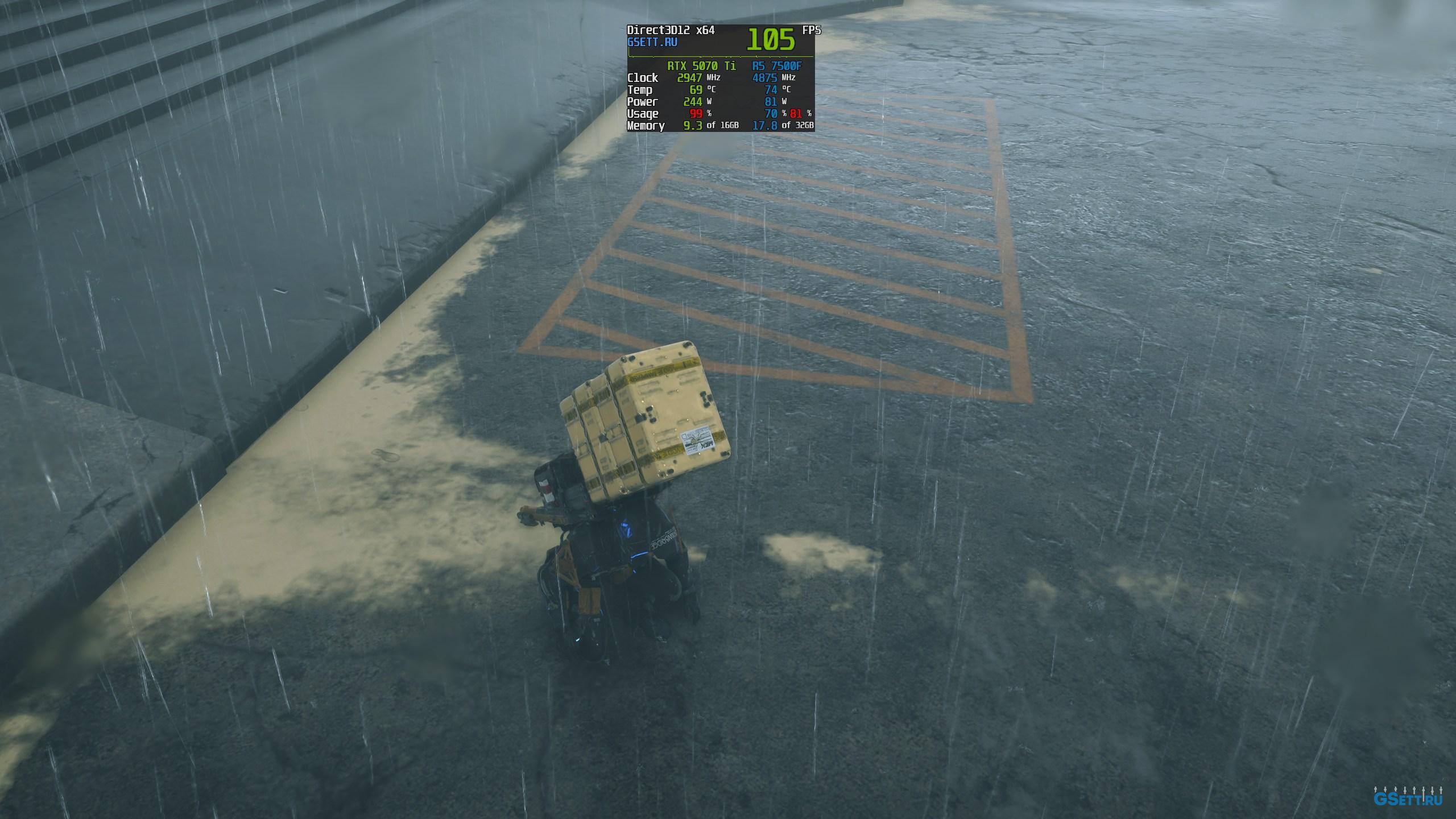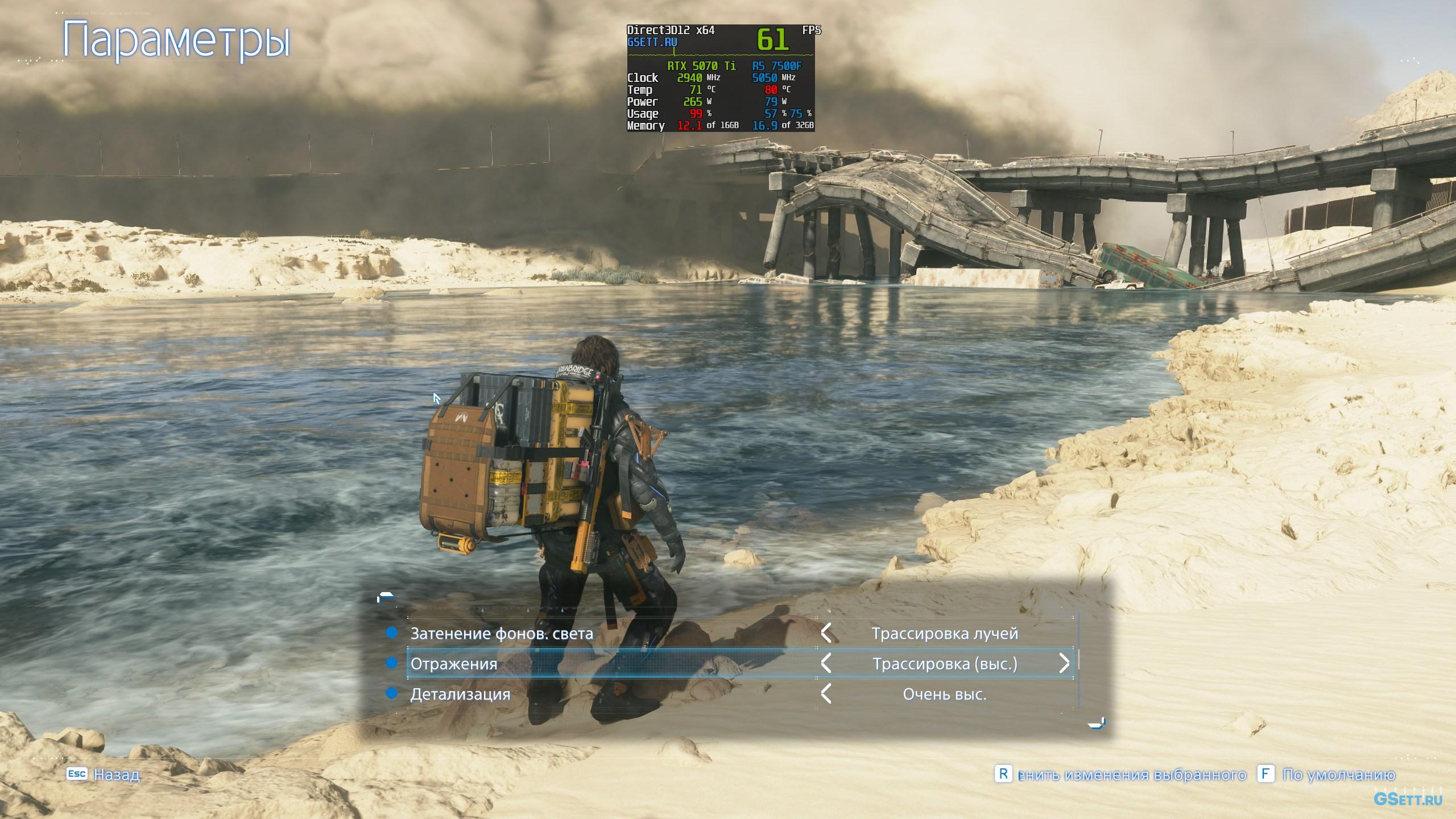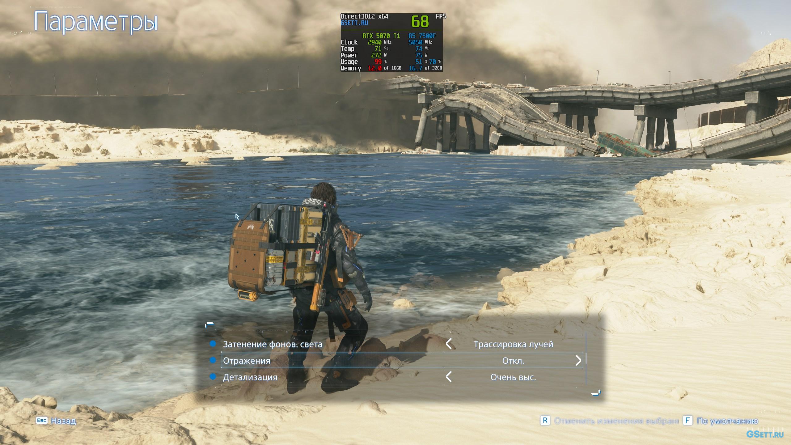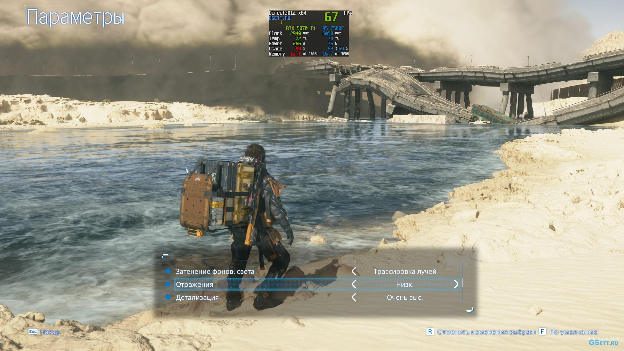 Для создания отражений в Death Stranding 2 также можно задействовать трассировку лучей. И с этим есть пара особенностей. Вариант «Трассировка очень выс.» сильно снижает производительность, особенно во время дождя, даже когда в сцене нет никаких отражающих поверхностей. Поэтому использовать я его настоятельно не рекомендую.