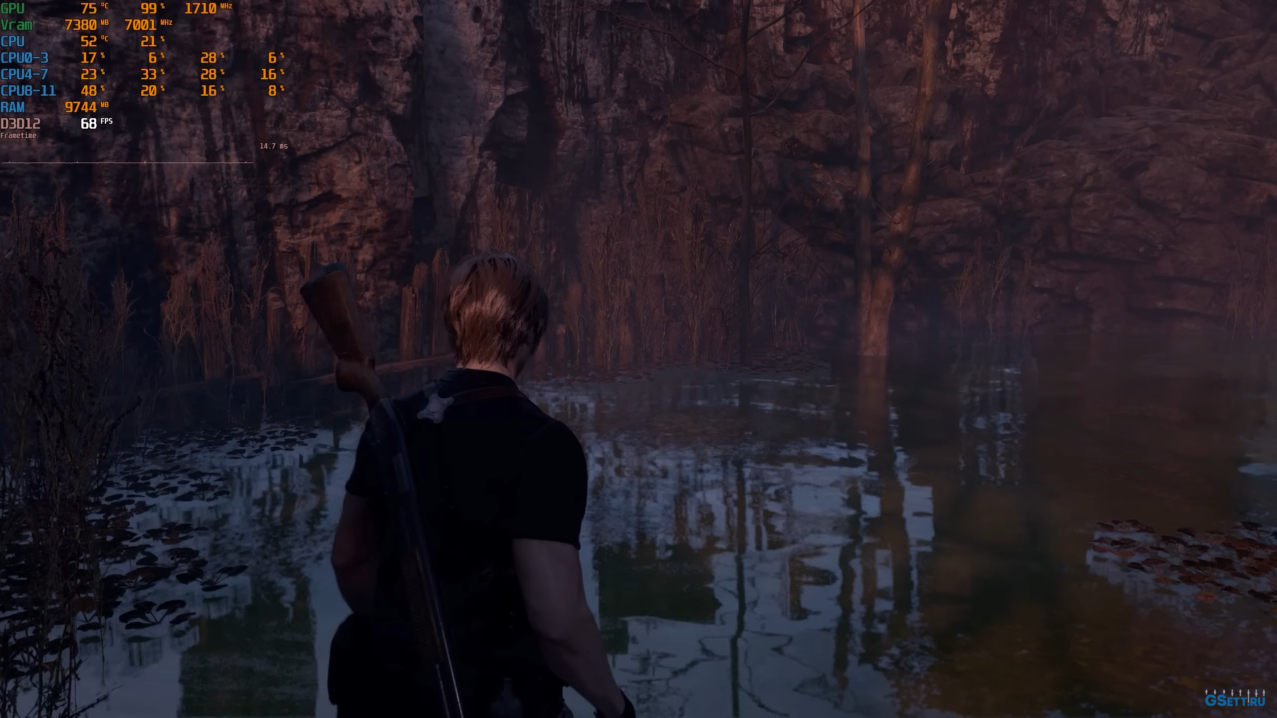 В «Resident Evil 4 Remake» далеко не самая лучшая реализация трассировки лучей, и в большинстве сцен вы попросту не увидите никакой визуальной разницы, чего не скажешь о частоте кадров. Чаще всего отличия можно будет увидеть в отражениях на воде: